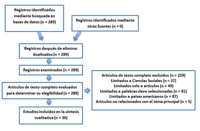 Realizada la búsqueda, se encontraron un total de 289 documentos científicos en Scopus (2021-2025), Se descartaron 259 debido a todos los filtros detallados en la Figura 1. Por lo tanto, las unidades de observación constan de 30 estudios finales.