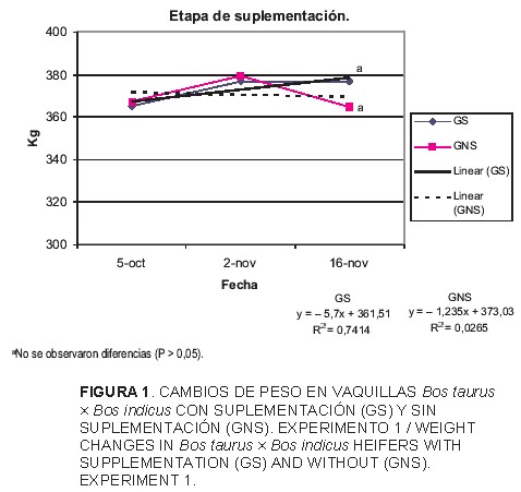TABLA II. CAMBIOS DE PESO EN NOVILLAS CON O SIN SUPLEMENTO EN LOS DOS EXPERIMENTOS / WEIGHT CHANGES IN HEIFERS WITH OR WITHOUT SUPPLEMENT IN BOTH EXPERIMENTS.