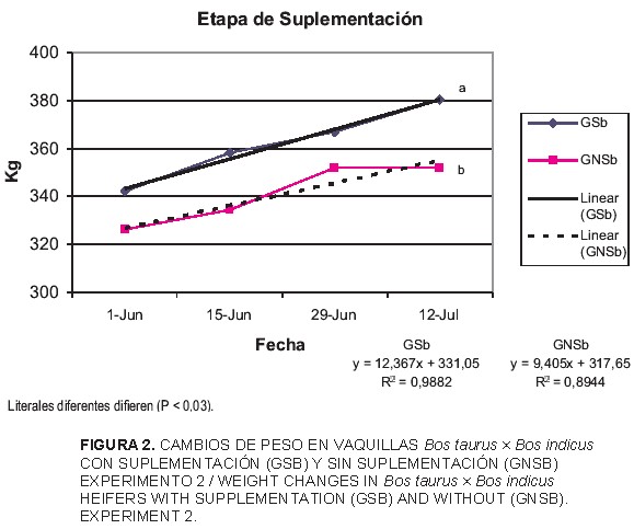En el experimento 2 se detectó un mayor peso final en el grupo con suplemento (TABLA II), sin detectarse cambios en la ganancia de peso. A diferencia del experimento 1, en este ensayo si se detectó una respuesta lineal (P < 0,05) en el peso vivo con relación a los días de alimentación en ambos grupos (FIG. 2), que mostraron un balance positivo. Se sabe que los forrajes pueden presentar gran variación en disponibilidad y calidad entre años, y entre épocas [14]. Es posible que el forraje haya tenido una mayor concentración de proteína, lo cual permitió una mayor ganancia en ambos grupos. Estudios realizados por Zuart y col. [31], con toretes en el trópico húmedo del estado de Chiapas, mostraron una mejor respuesta en los animales suplementados con proteína de sobrepaso (GDP 0,757 kg/d), mientras que los animales testigo tuvieron menor ganancia (0,310 kg/d).
