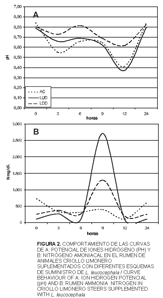 El pH ruminal tiende a mantenerse constante en el tiempo, bajo la condición alimenticia de L. leucocephala 2 veces al día, mientras que la liberación de nitrógeno en el rumen aunque fue menos uniforme en los tratamientos con leucaena, tiende a distribuirse mejor con el suministro dos veces al día.
