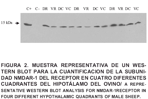 Los aminoácidos excitatorios (AAEs), L-glutamato y aspartato, son considerados las principales sustancias endógenas neuroactivas involucradas en la transmisión excitatoria. El receptor N-metíl-D-aspartato (NMDAR) es uno de los principales receptores de los AAEs. Este receptor estimula la secreción de la hormona luteinizante (LH) al facilitar la secreción de la hormona liberadora de las gonadotrofinas (GnRH). En este estudio se plantearon dos objetivos: Estandarizar la técnica de Western blot para identificar la subunidad-1 del NMDAR (NMDAR-1) en hipotálamo del ovino; y determinar si existe diferencia en la distribución de la NMDAR-1 en los diferentes cuadrantes hipotalámicos (cuadrantes dorsal-rostral, ventral-rostral, dorsal-caudal, y ventral-caudal) del ovino. Se utilizaron 100 µg de proteína total para identificar la NMDAR-1 en el hipotálamo ovino. Se evidenció un efecto del cuadrante o porción del hipotálamo ovino sobre la expresión proteica de la NMDAR-1. En particular, el cuadrante dorsal-rostral (31,5567 densidad óptica ± 13,0831; P<0,05) expresó más cantidad del receptor que el cuadrante ventral caudal (17,1517 densidad óptica ± 13,0831; P<0,05) y que el cuadrante ventral-rostral (16,4683 densidad óptica ± 13,0831; P<0,05). Estos resultados demuestran que el receptor NMDA se expresa más en la región rostral del hipotálamo del ovino, área en la cual se encuentran distribuidos los cuerpos celulares y axones de las neuronas productoras de GnRH. Estos resultados sugieren la participación de la vía glutamatérgica en la regulación de la reproducción de los ovinos.