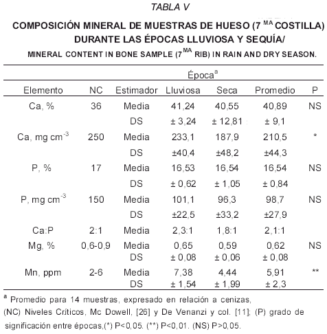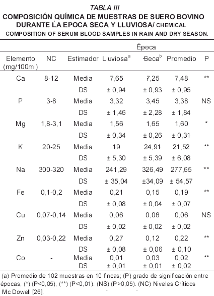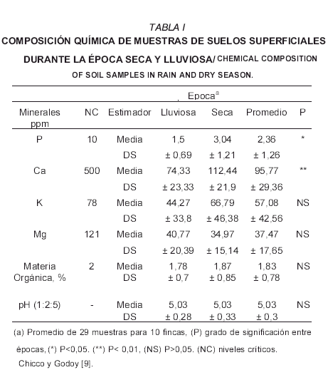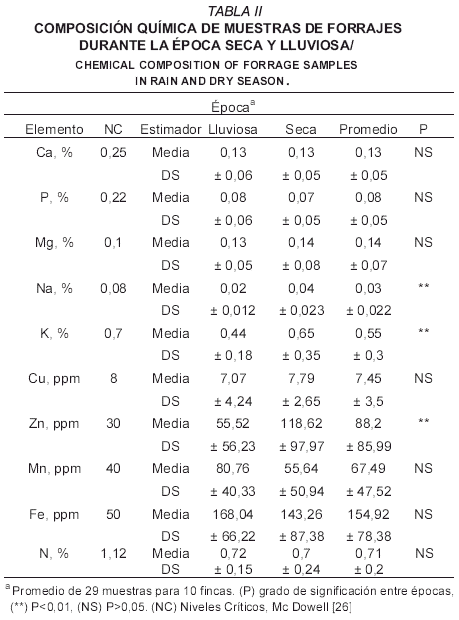 En el forraje (TABLA II), el nivel promedio de calcio fue de 0,13%, para ambas épocas, por debajo del nivel crítico para cubrir los requerimientos del animal (0,22%). Esta concentración es similar (0,18%) a la reportada por Chicco y Godoy [4]. El calcio por formar parte de la pared de las células vegetales no se moviliza de las hojas maduras a las jóvenes o partes reproductivas de la planta como ocurre en la mayoría de los nutrimentos, por lo que, el calcio se acumula en hojas maduras y puede ser deficiente en frutos, hojas jóvenes o en las partes terminales de las plantas, debido a que la translocación a estos órganos es muy baja [36].