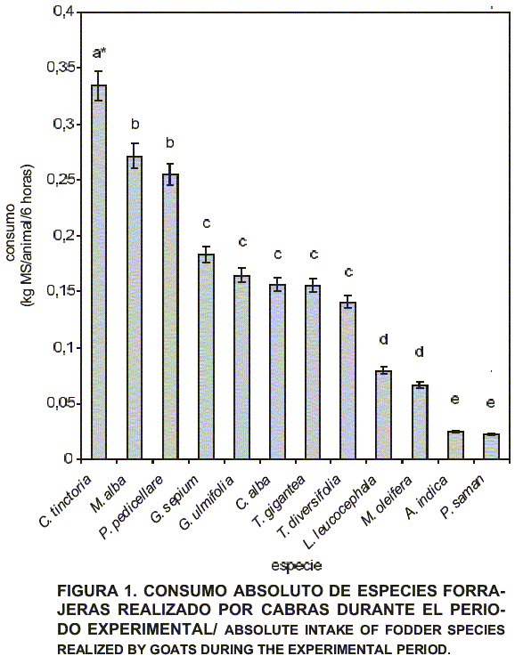 En la prueba de cafetería realizada con cabras la especie más consumida fue la Mora (C. tinctoria), seguida por M. alba y P. pedicellare; mientras que G. sepium, G. ulmifolia, C. alba, T. gigantea y T. diversifolia fueron medianamente apetecidas. El consumo de L. leucocephala y M. oleifera fue bajo y las forrajeras menos consumidas fueron A. indica y S. saman.