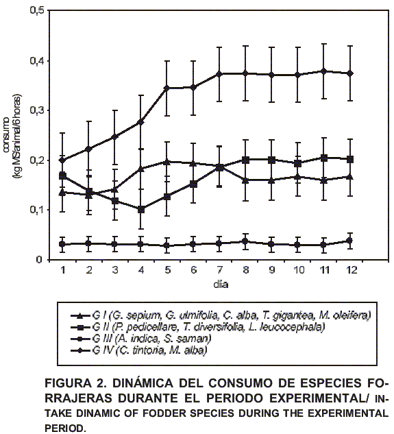 Se observaron cuatro tendencias definidas. En las especies G. sepium, G. ulmifolia, C. alba, T. gigantea y M. oleifera se observó un aumento del consumo entre el tercer y quinto día. En P. pedicellare, T. diversifolia y L. leucocephala el consumo disminuyó hasta la cuarta medición. Un tercer grupo estuvo formado por las especies que fueron poco consumidas (A. indica y S. saman), las cuales no presentaron variaciones sustanciales del consumo durante todo el periodo experimental. Por su parte, el consumo de las integrantes de la familia Moraceae (C. tinctoria y M. alba) aumentó sostenidamente entre el primer y quinto día.