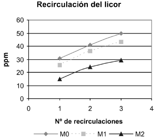 La adición de mineral fresco a los licores de lixiviación en cada recirculación mostró los siguientes resultados.