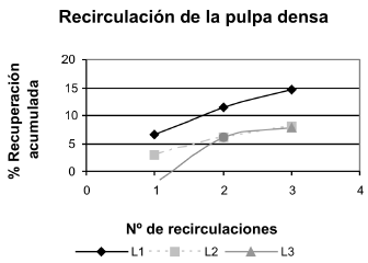 En cuanto a la recirculación de la pulpa densa de lixiviación se obtuvo el siguiente comportamiento: