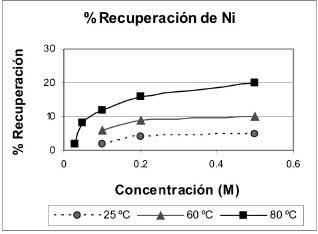 De igual forma que con el ácido sulfúrico, la recuperación de los elementos se ve favorecida con un aumento de la temperatura y la concentración hasta los niveles estudiados, donde las más altas recuperaciones se obtuvieron a 0,5M y 80ºC, con un 20,29% de níquel y 39,875% de cobalto con una cantidad de 405,80 ppm de níquel y 79,75 ppm decobalto. Adicionalmente, se realizaron estudios con concentraciones de ácido cítrico por debajo de 0,1M donde se encontraron recuperaciones inferiores al obtenido a 0,1M, con lo cual no sería recomendable trabajar con estas concentraciones a nivel industrial. De igual forma, concentraciones de 0,2M y 0,5M representan un aumento considerable en el consumo del ácido sin que esto represente un aumento en la extracción de los elementos de interés (Ni y Co).