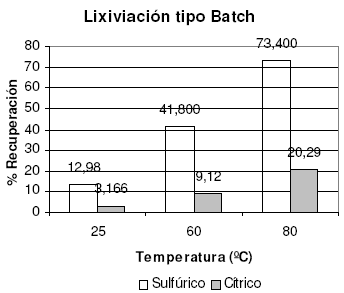 En la figura anterior, se colocaron las máximas recuperaciones encontradas para ambos ácidos, donde se puede apreciar que el ácido sulfúrico posee una capacidad de extracción muy superior a lo conseguido por el ácido cítrico. Esto se debe a su carácter de ácido fuerte.
