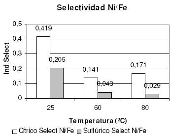 Se puede apreciar que la selectividad, por el contrario al porcentaje de recuperación, favorece al ácido cítrico con lo cual se convierte en un agente lixiviante de interés a pesar de su bajo poder de lixiviación. Esto se debe a su carácter de ácido débil, con lo cual no es capaz de reducir a los iones Fe+3 en Fe+2 que son los iones con los que interactúa en el quelato [3]. Adicionalmente, debido a la interacción química que se produce entre el ácido cítrico y los iones metálicos en solución, el cobalto presenta mayor porcentaje de recuperación que el níquel debido a que el cobalto posee una estructura más estable con una afinidad y grado de covalencia mayor que el níquel en solución formando los quelatos respectivos.