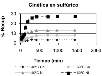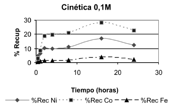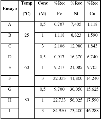El comportamiento general muestra que al llegar a 3M existe un máximo en las curvas de recuperación. Esto se comprobó experimentalmente al realizar ensayos a 5M con el mismo volumen, a 80ºC por 4 horas, con resultados de 74,98% de níquel, 36,98% de cobalto y 83,37% de hierro, donde estos resultados son muy cercanos a los encontrados en la Tabla I para 3M a 80ºC. Esto demuestra que por encima de 3M no resulta viable la lixiviación con el ácido sulfúrico.