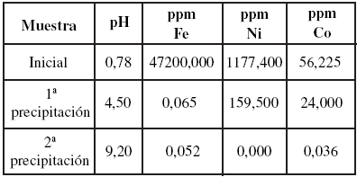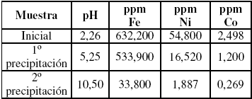 Se puede notar que la primera precipitación ocurre a un pH 5,25 con un porcentaje de los elementos que precipitaron en 69,85% en níquel, 51,96% en cobalto y 15,55% en hierro. Donde se aprecia que la adición de cal en licores de ácido cítrico mejora la selectividad en la precipitación en cuanto al hierro. Sin embargo, cuando se realizó la difracción de rayos X solamente se encontró calcita como fase existente. Esto se debió a que la cantidad de cal que se agregó en la precipitación fue muy alta y ello produjo la aparición de esta fase opaca a las demás en el difractograma.
