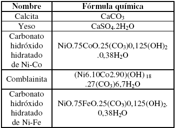 Se puede apreciar en la tabla anterior que la primera precipitación ocurre a un pH de 4,50 con un porcentaje de los elementos que precipitaron en 99,99% de hierro, 86,45% de níquel y 57,31% de cobalto. Esto indica que la precipitación resultó efectiva pero no fue selectiva con el hierro ya que fue el elemento que precipitó en mayor proporción. Los precipitados analizados por difracción de rayos X indicaron una alta presencia de yeso debido a la alta cantidad que se necesita agregar de cal. El resto de las fases probables se aprecia a continuación: