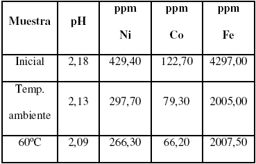 Se puede notar que tanto a temperatura ambiente como a 60 ºC ocurre una disminución de los ppm que quedan en los licores después de la precipitación. Sin embargo, la cantidad que precipita al inyectar el gas a mayor temperatura es mayor, con un 37,98% en níquel, 46,05% en cobalto y 53,28% en hierro.