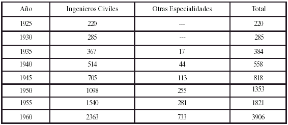 Tabla 1 Ingenieros inscritos en el CIV según especialidad 1925-1960