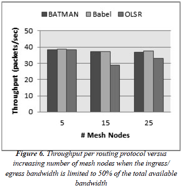 In Figure 5 to Figure 7, we compare the throughput as a function of the number of mesh nodes. It is seen that, when the available bandwidth is 25% of the total (Figure 5), all the routing protocols behave similarly regardless of the number of nodes. Otherwise, when the bandwidth restrictions are relaxed (Figure 6 and Figure 7), BABEL and B.A.T.M.A.N. provide better throughput than OLSR for network sizes of 15 and 25 mesh nodes. For a small network of 5 mesh nodes, the three protocols perform similarly.