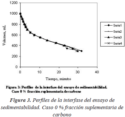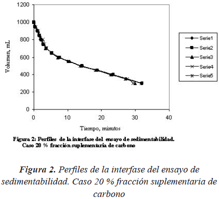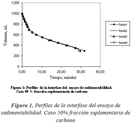 Las Figuras 1, 2 y 3 que se muestran a continuación presentan las curvas de sedimentabilidad del licor mezclado obtenidas para cada una de las tres fracciones suplementarias de carbono ensayadas. Se hace la observación que se hicieron cuatro (4) series de ensayos con las fracciones de 50% y 0% de carbono adicional y cinco (5) series con la fracción de 20% y las mismas permitieron calcular valores promedio de los parámetros característicos del proceso de sedimentación.