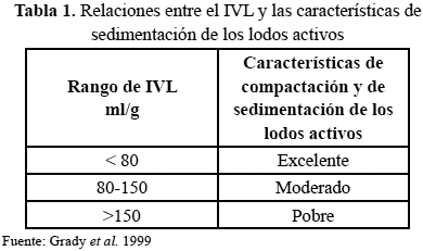 et al. (2009), y se basa en las propiedades físicas de los Sólidos Suspendidos del Licor Mezclado (SSLM). El IVL cuantifica el volumen de estos lodos expresado en unidades de ml/g. Se mide como la altura, expresada en "ml" de la interfase de los sólidos después de sedimentar el licor mezclado del biorreactor durante 30 minutos, en un cilindro graduado de 1.000 ml, dividido por la masa de sólidos expresada en gramos. Esta masa es el conocido parámetro SSLM característico de los reactores de cualquiera de las variantes de lodos activados. El resultado representa el volumen ocupado por un gramo de sólidos suspendidos en el licor mezclado, conocido como el Índice Volumétrico de los Lodos. El ensayo, estandarizado para mayor reproducibilidad, ha sido usado muy frecuentemente para describir la conducta de sedimentación del lodo (Crites & Tchobanoglous, 2000; Metcal & Eddy, 2003). No obstante, la aplicabilidad general de esta medición ha sido cuestionada debido a la dependencia con la concentración de sólidos y el diámetro del cilindro usado en el ensayo. Sin embargo, a pesar de sus deficiencias, el IVL es la medida de compactibilidad de los lodos más ampliamente utilizada por los investigadores del área (Silverstein & Schroeder, 1983; Rittmann & McCarty, 2001; Metcalff & Eddy, 2003; Rössle et al. 2009; Wett et al. 2011). Los lodos floculados con un IVL de 150 ml/g frecuentemente son considerados como la línea divisoria entre un lodo voluminoso (valores por encima) y no voluminoso. Grady et al. (1999) consideran que valores por debajo de 80 ml/g son excelentes y entre 80 y 150 ml/g son moderados. Rössle et al. (2009) consideran que un IVL entre 100 y 150 ml/g indica una buena sedimentación y que valores superiores, generalmente, pero no siempre, están asociados con el fenómeno del levantamiento de los lodos ("bulcking") indicando una pobre sedimentación y una baja velocidad de sedimentación. Pophali et al. 2009 indican que valores de IVL entre 76 y 80 ml/g pueden considerarse indicadores de una buena sedimentabilidad.Para alcanzar una buena sedimentación y compactación de la biomasa floculenta que constituye la mayor parte de los sólidos suspendidos en el licor mezclado es necesario contar con un balance apropiado entre las bacterias formadoras de flóculos y las filamentosas. En tal caso se obtiene un lodo compacto y fuerte que sedimentará rápidamente (Grady