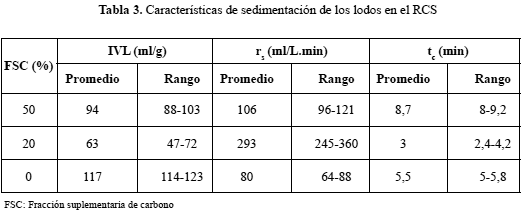 Las características de los lodos producidos en el RCS y medidas con el IVL indican una conducta de sedimentación excelente cuando la fuente suplementaria de carbono añadida era 20% y buena para 50 y 0%.