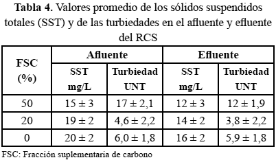 Parámetros asociados con el desempeño de la sedimentación como es el caso de los SST y la turbiedad alcanzan valores muy bajos en el efluente del RCS, corroborando la información suministrada por el IVL y puede observarse en la Tabla 4. Los valores promedio presentados por los SST en el efluente cumplen con creces la normativa referida a los vertidos en cuerpos de agua del país (Decreto 883, MARNR, 1995). Aunque la turbiedad no aparece en los parámetros normados para vertidos puede apreciarse que los valores obtenidos son bajos y es señal de una buena clarificación.