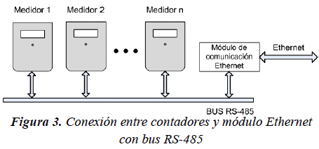 La etapa de comunicación permite la recolección de datos de forma centralizada de un grupo de contadores, lo que trae como beneficios la disminución de costos de instalación, mano de obra y traslados hacia los contadores. Como arquitectura de red se utilizó la más conocida y eficiente, que es la conexión en bus. Todos los contadores se conectan a un bus principal, por medio de ramales cortos, y las señales que pasan por el bus llegan a todos los nodos, pero existe una comunicación maestra que indica cuál contador tiene permiso para transmitir (Kinnaird, 2004). Existen muchas maneras de comunicar varios contadores por un bus. Un método muy conocido es el uso de un par de cables trenzados, con señales diferenciales RS-485, definido en la especificación ISO-8482 (International Standard ISO/ IEC 8482:1993). Este método posee una alta inmunidad al ruido, rápida tasa de transferencia y permite colocar una gran cantidad de nodos en un solo bus. La etapa de comunicación LAN fue desarrollada con base en un módulo de comunicaciones Ethernet comercial. Dicho módulo fue colocado fuera de los contadores como se muestra en la Figura 3, ya que se tiene la ventaja que la alimentación del módulo quedará a cargo de la empresa eléctrica, sin generar facturaciones adicionales a los usuarios. El módulo Ethernet utilizado presenta las siguientes características generales: