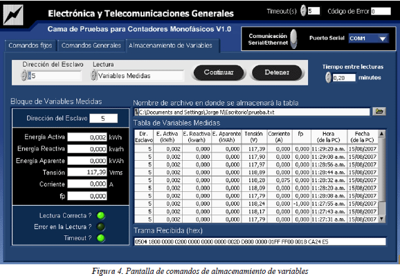 Esta ventana, como se ilustra en la figura 4, permite el almacenamiento de tres grupos de variables: variables medidas, valores de fábrica y contadores (número de encendidos del equipo, número comunicaciones en el bus, número respuestas del esclavo, número comunicaciones con error en el CRC y, finalmente, número de comunicaciones con respuesta de excepción). Este almacenamiento se realiza en tablas que pueden ser observadas en pantalla y esto ocurre cada vez que se oprime el botón de continuar. Adicionalmente, el almacenamiento de variables medidas permite guardar los resultados en un archivo de texto de manera automática, haciendo uso de un control en el cual se coloca el tiempo en minutos entre mediciones.