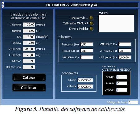 Los contadores de energía deben ser calibrados ajustando diferentes valores de ganancia y compensaciones. Estos procedimientos de ajuste pueden ser logrados utilizando un contador patrón como referencia o utilizando una fuente estable de calibración. Los procedimientos de calibración se hicieron por medio de comunicaciones entre la unidad de control del contador y un software de calibración desarrollado. Este software asegura que el procedimiento de calibración se lleve en el orden correcto, además de ayudar con los cálculos matemáticos. Son 4 las calibraciones que se deben realizar en cada contador para asegurar su correcto funcionamiento: