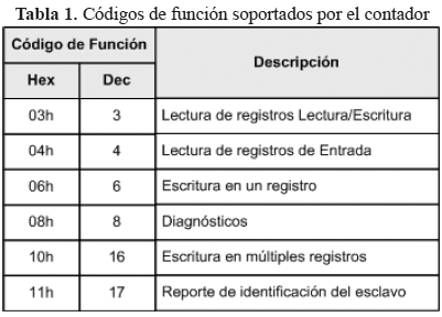 La comunicación del módulo se realizó a través de un programa suministrado por el fabricante, el cual permite desde la verificación y cambio de clave, hasta la selección de la dirección IP que utilizará el módulo. Para la integración de este módulo al desarrollo realizado, las variables más importantes que se configuraron fueron la dirección IP del módulo y el puerto de comunicaciones TCP, para poder lograr la comunicación LAN con el software de pruebas desarrollado que se describirá más adelante. Para la comunicación de la información se utilizó el protocolo Modbus RTU, el cual es un estándar abierto y ampliamente utilizado hoy en día. Este protocolo establece un paquete bien definido para realizar la comunicación de manera confiable (Modbus-IDA, 2004; Modbus-IDA, 2002). El contador de energía diseñado soporta los códigos de función que se ilustran en la Tabla 1.