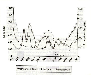 Se encontraron diferencias altamente significativas en los diferentes cortes realizados entre tratamientos (P<0,01) para los meses de julio de 1998, enero, febrero, junio y julio de 1999, mayo, junio y julio de 2000; y diferencias significativas (P<0,05) en agosto de 1998, marzo de 1999 y abril de 2000 con los rendimientos más elevados en el tratamiento de sabana más banco de energía (Figura 1). En la misma Figura, se observa igualmente la curva de la precipitación, la cual siempre estuvo por encima de los 90 mm/mes durante el primer año de evaluación, explicando el comportamiento de los tratamientos y las respuestas atípicas discutidas anteriormente.
