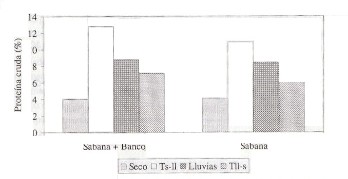 Valor nutritivoNo se encontró diferencia significativa (P>0,05) entre tratamientos para el contenido de proteína cruda, observándose que en el tratamiento con el banco de energía apenas llegan a cubrir el nivel crítico del 7% en bovinos a pastoreo. Sin embargo, para los períodos de Transición si se encontró diferencia significativa (P<0,05) entre tratamientos, obteniéndose valores elevados de proteína a inicios del período lluvioso (11 y 13%), producto de los rebrotes de las plantas de la sabana y del pasto introducido Urochloa humidicola (Figura 2).