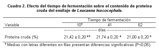 Con respecto al tiempo de fermentación se encontró que el mayor valor de proteína cruda se obtuvo a los 41 días y que dicho tenor disminuyó significativamente a los 62 días de fermentación (Cuadro 2), lo cual puede relacionarse con un efecto del Nt el cual también se incrementó para la segunda fecha de muestreo (41 días). Sin embargo, la disminución de los valores de PC no fueron tan drásticos entre las diferentes edades de fermentación. Esto pudo deberse al alto contenido de PC que presenta la Leucaena leucocephala, la cual varía poco a través del tiempo, aunado a las condiciones favorables suministradas durante la realización de los silos para evitar la solubilización de las proteínas, tal como el troceado fino, con lo cual se acelera la plasmólisis de las hojas ya que el proceso respiratorio es más largo en estas plantas (Ojeda et al., 1991).