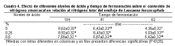 Estos resultados coinciden con resultados obtenidos por Ojeda et al., (1990) quienes reportaron que la adición de ácido fórmico mejoró la calidad fermentativa del ensilaje al disminuir el contenido N-NH3/Nt.
