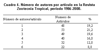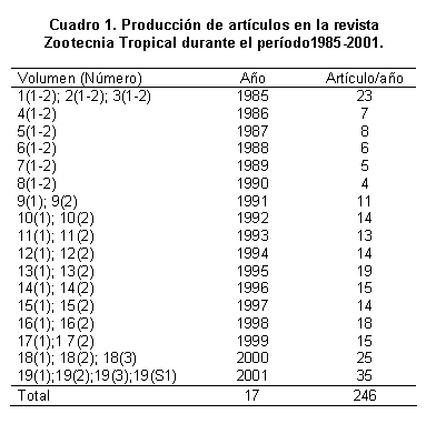 La revista ZT cuenta con un total de 246 trabajos originales, con una producción promedio para el período de 14 artículos por año (Cuadro 1). Esta última cifra se encuentra en el promedio de la producción editorial de revistas de calidad comparable en la región, por ejemplo: Agricultura Técnica de Chile (12,83); Archivos de Medicina Veterinaria de Chile (17,18); Biological Research de Chile (10,9); Interciencia de Venezuela (6,5); Revista UNELLEZ de Ciencia y Tecnología de Venezuela (11,0); Acta Agronómica de Colombia (10,5). Es de destacar que en los últimos seis años (1996-2001) se publicaron más de la mitad (54,7%) de la producción total de trabajos de la revista.