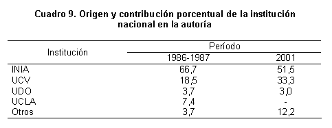 En el Cuadro 9 se destaca el origen de la autoría de contribución nacional para los períodos inicial y final. Se puede interpretar que la colaboración INIA-UCV se ha estrechado, dado que algunos investigadores del área forman parte del personal docente de las facultades de Agronomía y Ciencias Veterinarias de la UCV, así como por el creciente número de participación de los investigadores del INIA en tutorías, trabajos de grado, y asesorías de tesis. La creación de nuevas revistas universitarias atrae a sus investigadores a escribir en ellas, como es el caso de BIOAGRO, de la Universidad Centro Occidental Lisandro Alvarado (UCLA), que le ha restado autores y contribuciones a la revista ZT.