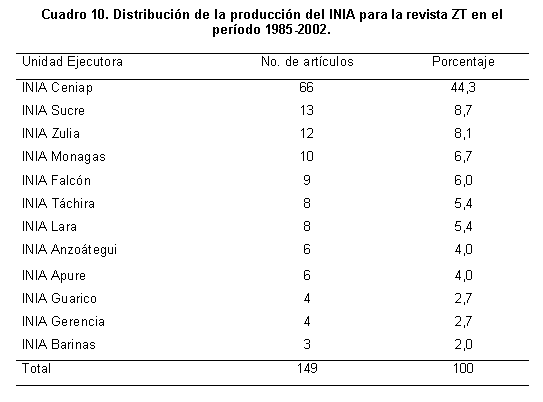 En el Cuadro 10 se muestra la distribución de la producción para el INIA, discriminado por sus diversas unidades ejecutoras para el período 1985 y 2001. El Centro Nacional de Investigaciones Agropecuarias muestra la mayor producción de artículos para el período.