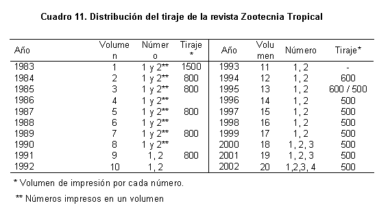 La variación del tiraje a través del período de estudio se muestra en el Cuadro 11, donde se observa el ajuste de la oferta impresa a la demanda de los usuarios. El tiraje es similar al de las revistas científicas nacionales del área agrícola, como lo constata Chaparro (2001) y ello denota en líneas generales que los mismos son relativamente bajos, entre 350 y 1000 ejemplares.