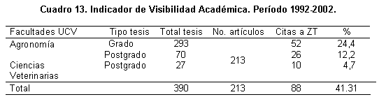 En el Cuadro 13 se muestra la visibilidad de ZT en la elaboración de trabajos de grado y tesis de postgrado en el área de Producción Animal, para un mismo lapso (10 años), pero para el período 1992-2002. Para ese período la revista ZT presentó una producción de 213 artículos, de los cuales 88 de ellos fueron citados en las tesis, lo que indica un Índice de Visibilidad en el sector Académico de 22,56% en promedio, en la elaboración de trabajos de grado y tesis de postgrado en el área de Producción Animal de la Universidad Central de Venezuela; esto puede tener su explicación en la cercanía e interrelación entre el INIA-CENIAP y las facultades de Agronomía y Ciencias Veterinarias de la UCV. No se inventariaron las tesis de otras universidades.