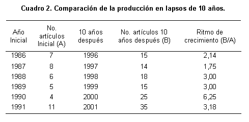 En el Cuadro 2 se muestra comparativamente la producción en lapsos de 10 años, indicando un ritmo de crecimiento entre 1,75 (1987-1997) y 6,25 (1990-2000). Para el período en estudio la revista tuvo un Índice de Crecimiento Promedio de 3,2. Price (1963) indica que un valor de 2 o más es indicador de un crecimiento normal.