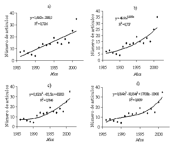 Figura 1. Tendencias de crecimiento de los artículos de la Revista Zootecnia Tropical a través de los años, desde 1985 hasta 2000. a) Lineal, b) Exponencial, c) y d) Polinomiales de segundo y tercer grado, respectivamente.