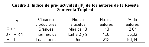 En el Cuadro 3 se muestra el índice de productividad de la revista ZT. Sólo existen 10 autores (que representan aproximadamente 3% del total) que poseen un IP≥1 y que pueden ser considerados como grandes productores; es decir, han publicado 10 artículos ó más. Por el contrario, 213 (60% de los autores) han producido un solo artículo (IP=0). Analizado desde otro punto de vista, 36,8% de los autores han escrito entre 2 y 9 artículos, y 60,3% sólo ha publicado un trabajo. Aunque estas cifras hacen referencia tanto a autores principales como a coautores, están en concordancia con los datos obtenidos por Pérez (2003), quien señala que 61% de los autores (autor principal) con un solo trabajo, mientras que 18,3% ha publicado 2 y 19% entre 3 y 9 trabajos.