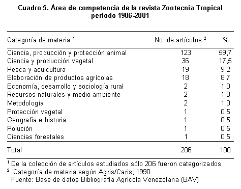 Como era de esperarse, la mayor proporción de los artículos en ZT se encuentran incluidos en la categoría de materia Agris/Caris: Ciencia, Producción y Protección Animal (FAO-CARIS-7, 1990) con aproximadamente 60%, lo que sumado a la categoría Ciencia y producción vegetal (Pastos y forrajes) y Pesca y acuicultura, abarcan 86,4% de los artículos publicados (Cuadro 5).