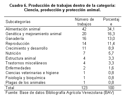 Discriminando dentro de la categoría Ciencia, producción y protección animal, aproximadamente 80% de los trabajos está dedicado a las subcategorías Alimentación, Genética Reproducción y Nutrición, lo que indica una alta especialización, tal como se observa en el Cuadro 6. Estos resultados son similares a los de Pérez (2003), al clasificar los trabajos de acuerdo con el contenido temático prevaleciente para la revista, y obtener 87% de los trabajos en las secciones de Alimentación, Manejo, Reproducción y Pastos y forrajes. La diferencia (7%) puede deberse a que el sistema de categorías de materia de AGRIS responde a criterios documentales donde hay una mayor precisión en la clasificación, mientras que Pérez (2003) reconoce que algunos trabajos se encuentran clasificados en más de una categoría. También es de destacar la coincidencia en la orientación temática con los resultados de Hernández (1998), quien clasifica los trabajos de grado en el área de Producción Animal (Zootecnia) de la Facultad de Agronomía de la UCV y obtiene 46% en Alimentación y nutrición, 14,5% en Pastos y forrajes, 19,2% en Producción y Manejo de fincas y 5, 2% en Mejoramiento, para un total de 84,9% en el conjunto.