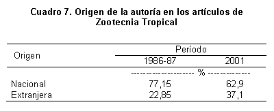 En el Cuadro 7 se destaca el origen de la autoría principal de los artículos, para dos períodos (inicial (1976-1987) y final (2001)), se observa un incremento de 14% en la contribución extranjera en el año 2001, con respecto al período inicial.