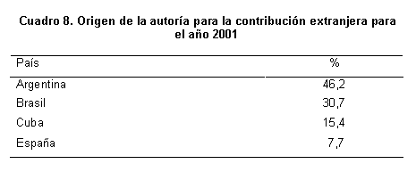 En el Cuadro 8 se muestra la contribución extranjera durante el año 2001, procedente de Argentina, Brasil y, en menor grado de Cuba y España.