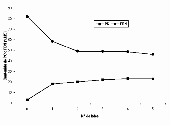 Figura 1. Variación de los porcentajes de proteína (PC) y fibra detergente neutra (FDN) en la cama de pollos, de acuerdo al número de lotes de aves.