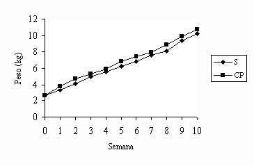No obstante, en ovejas tropicales, generalmente la producción de leche se destina en su totalidad a la cría de su(s) cordero(s), por lo que sería factible la suplementación de estos animales con cualquiera de estos recursos. De este modo, Pino (2001) realizó un experimento con ovejas tropicales y sus corderos. Las ovejas se alimentaban con pasto de corte como dieta basal y eran suplementadas con 500 g/día de dos suplementos: uno con 30% de CP y otro sin CP (S) y era medido entre otras cosas, el efecto de la suplementación sobre el crecimiento de los corderos y la variación de peso de las ovejas. Se obtuvo que las ovejas suplementadas con CP obtuvieron mayor peso promedio a lo largo del ensayo (P<0,05) en comparación con las suplementadas con el que no contenía CP (36,02 vs. 33,67 kg, respectivamente). Por otra parte, en los corderos hubo una ligera tendencia a mayores pesos promedios al destete para las crías de las ovejas suplementadas con CP con respecto a las suplementadas con S (P=0,067), siendo los pesos de 10,65 vs. 10,22 kg, respectivamente. En la Figura 2 se pueden observar las curvas de crecimiento de los corderos desde el nacimiento hasta el destete de los mismos.