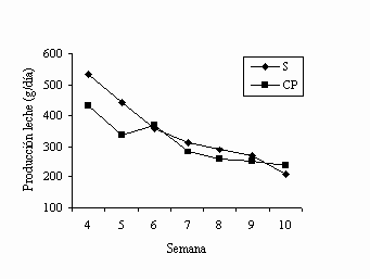 Por otra parte, Parra (2001), evaluando la producción de leche de estas ovejas, encontró que desde la 4ta hasta la 10ma semana de lactación, las ovejas produjeron en promedio 348±196,6 y 311±149,9 g/día para las suplementadas con S y CP, respectivamente (P>0,05). En la Figura 3 se pueden observar las tendencias de producción de leche para los dos grupos de animales a lo largo del ensayo.