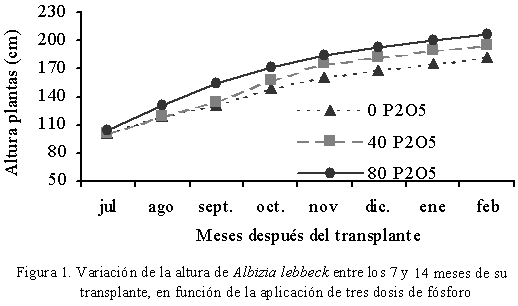 Todas las plantas presentaron un solo tallo y 64% de ellas con bifurcación en dos o tres ramas, después de los 95,8 cm. La altura promedio alcanzada durante la fase de vivero, que duró hasta los 6 meses, fue de 83,6 cm. Después del transplante y entre los meses de julio hasta mediados de octubre, que corresponde a la época de mayor precipitación en la región, las plantas mostraron un crecimiento acelerado (Figura 1), que luego disminuyó progresivamente. Entre febrero y mediados de junio del año siguiente no se observó crecimiento, ya que corresponde al periodo más crítico de la época seca en la región. La altura promedio de las plantas fue de 1,97 m a los 14 meses, con valores extremos de 1,52 y 2,55 m, encontrándose diferencias significativas a partir del segundo mes del transplante (P£ 0,001), solo por efecto del fósforo, cuya mejor dosis resultó ser 80 kg/ha de P2O5 durante todo el periodo.