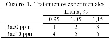 Los animales fueron asignados a 12 tratamientos en base a un diseño completamente aleatorizado con arreglo tipo factorial 3x2, tres niveles de inclusión del aminoácido lisina (Lis: 0,95, 1,05 y 1,15%) y dos niveles del aditivo ractopamina (RAC: 0 y 10 ppm). Sin embargo, hay que acotar que debido a requerimientos de la granja, cada corral debió conformase con una proporción igual de machos castrados y hembras, por lo que el factor sexo también fue considerado. Los diferentes tratamientos se muestran en el Cuadro 1.