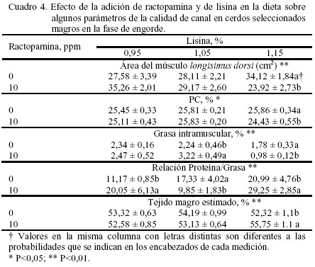 Esta respuesta resultó diferente a los resultados aportados por Schinckel et al. (2003), quienes observaron una tendencia de aumentó del AMLD a medida que se incrementaba el nivel de lisina (0 0,82 y 1,08%) en combinación con 20 ppm de RAC. Sin embargo, es importante considerar que los efectos de la RAC están influenciados por la sensibilidad de tejido adiposo y la baja regulación del β-adrenoreceptor (Liu et al., 1994).