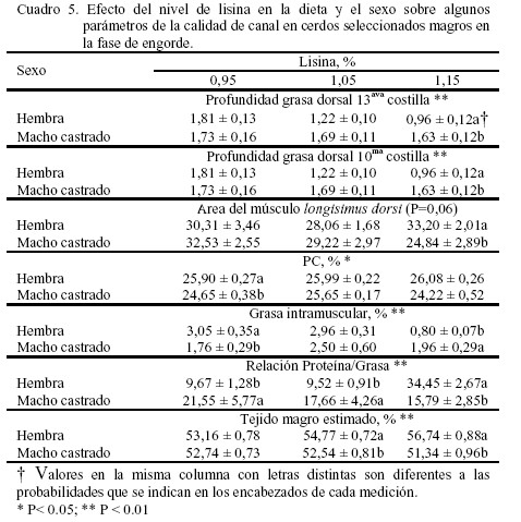 Cuando se comparo el nivel de lisina en la dieta con el sexo se observó una interacción (P<0,001) para la medición de PG13, siendo mucho menor para las hembras (1,22 y 0,95 cm) que para los machos castrados (1,69 y 1,63 cm) a los niveles 1,05 y 1,15% de lisina, respectivamente (Cuadro 5). Los resultados obtenidos en este experimento fueron inferiores a los reportados por Hansen y Lewis (1993) y Hahn et al. (1995); sin embargo, se destaca en ambas experiencias que las hembras tienden a tener un PG13 menor que el de los machos castrados, la cual tiende a disminuir al incrementar la concentración de lisina en la dieta.